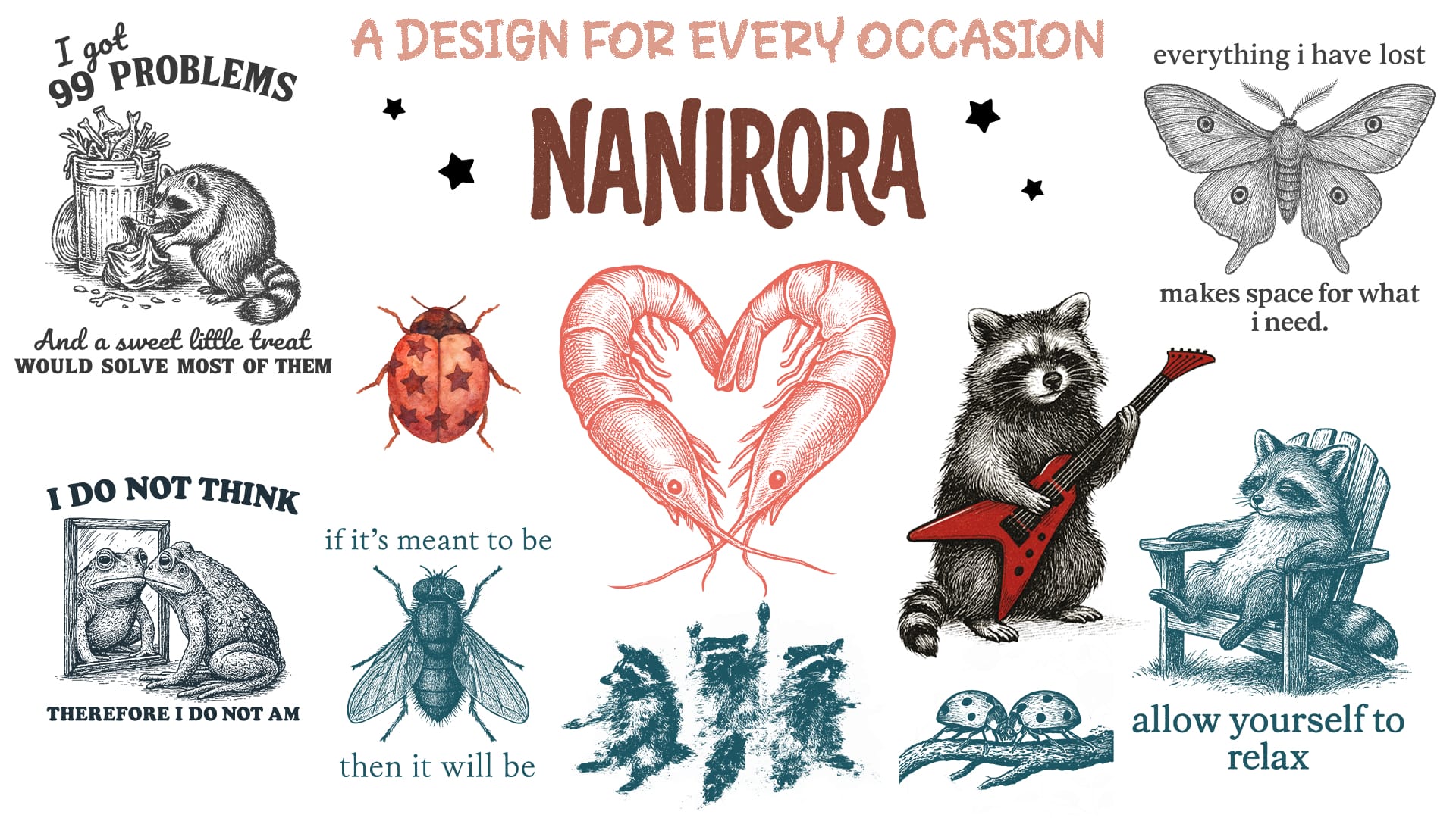 “Funny critter art turned into wearable chaos. Raccoons, possums and friends bringing feral energy to your everyday tee.”