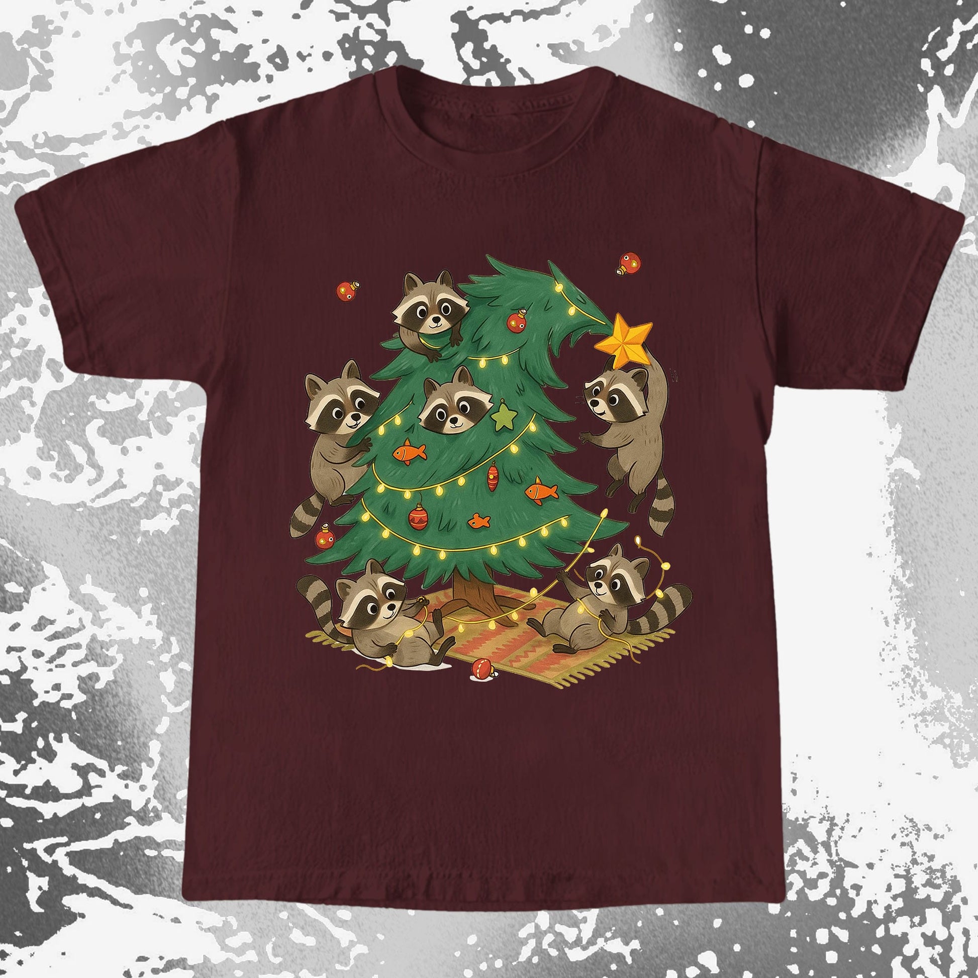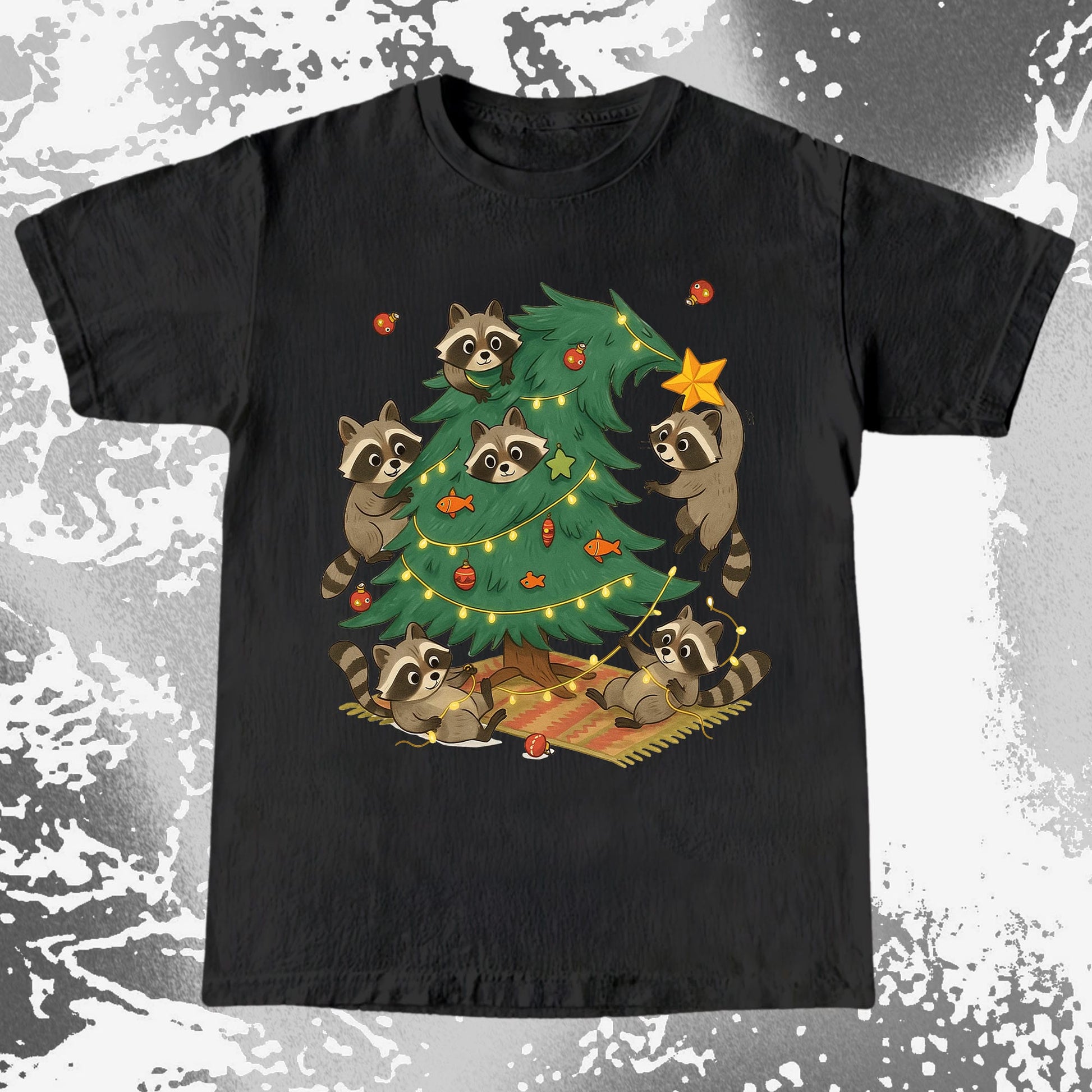 A whole squad of festive raccoons turning the Christmas tree into their personal playground. It’s a cozy dose of holiday chaos for anyone who celebrates with laughter, lights, and a little mischief.