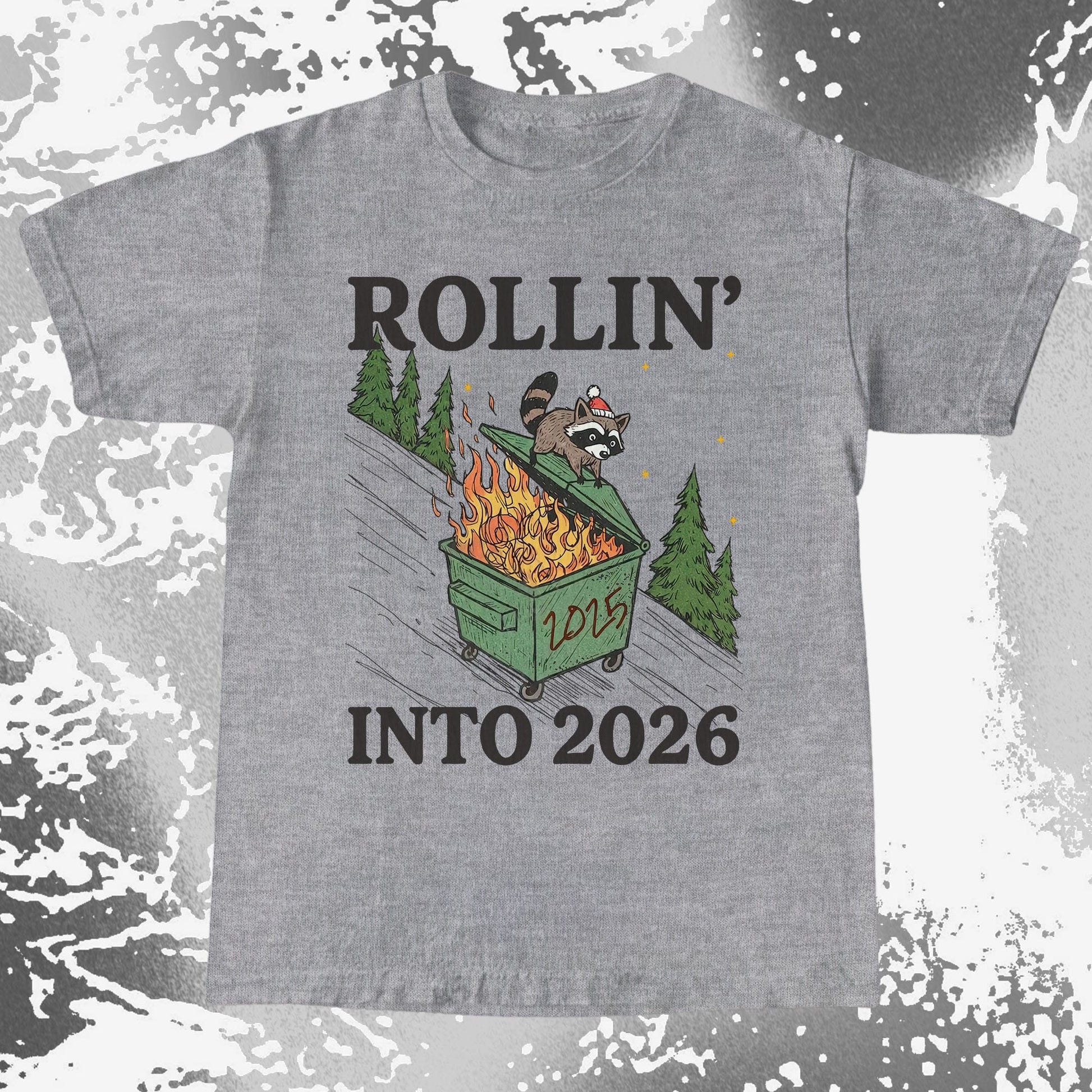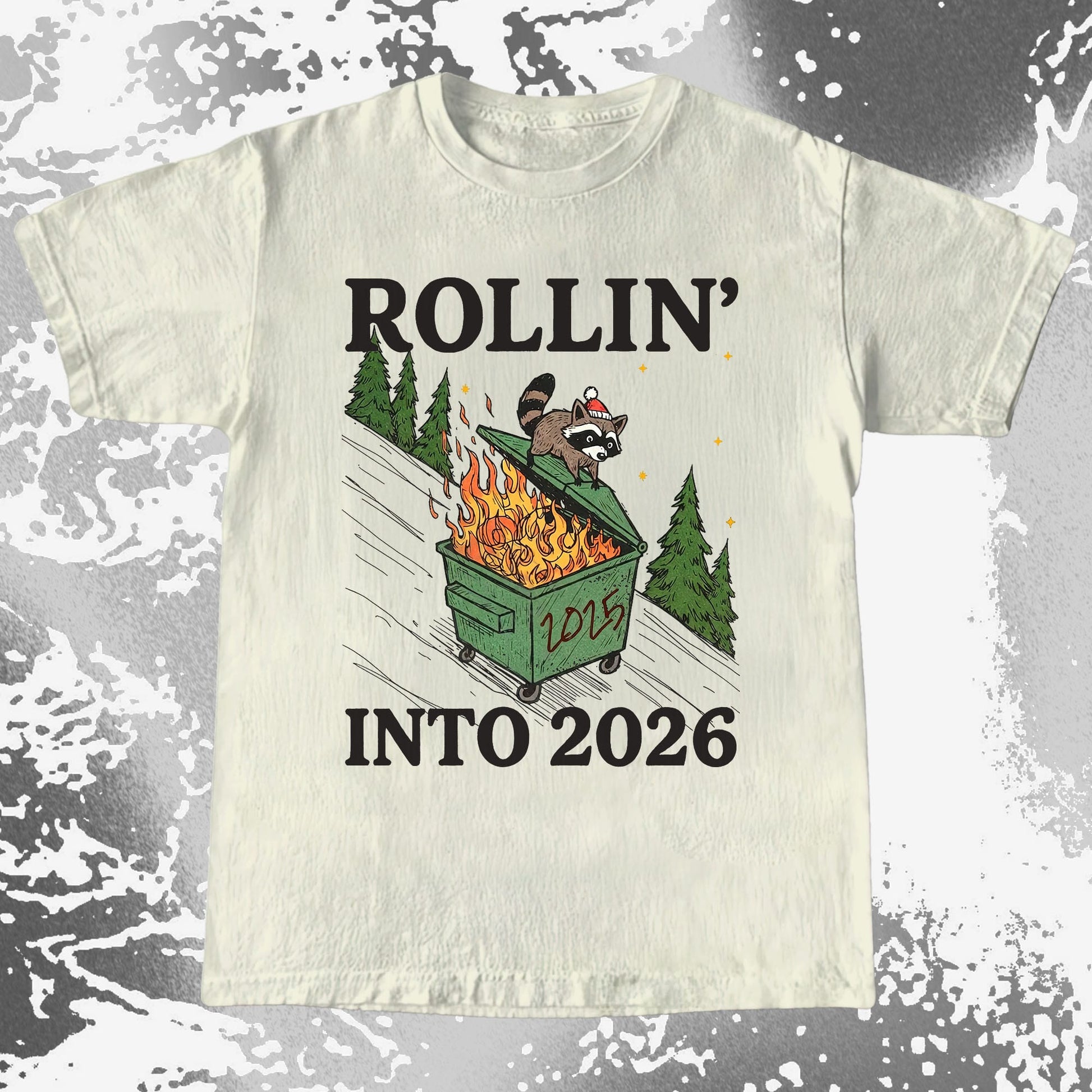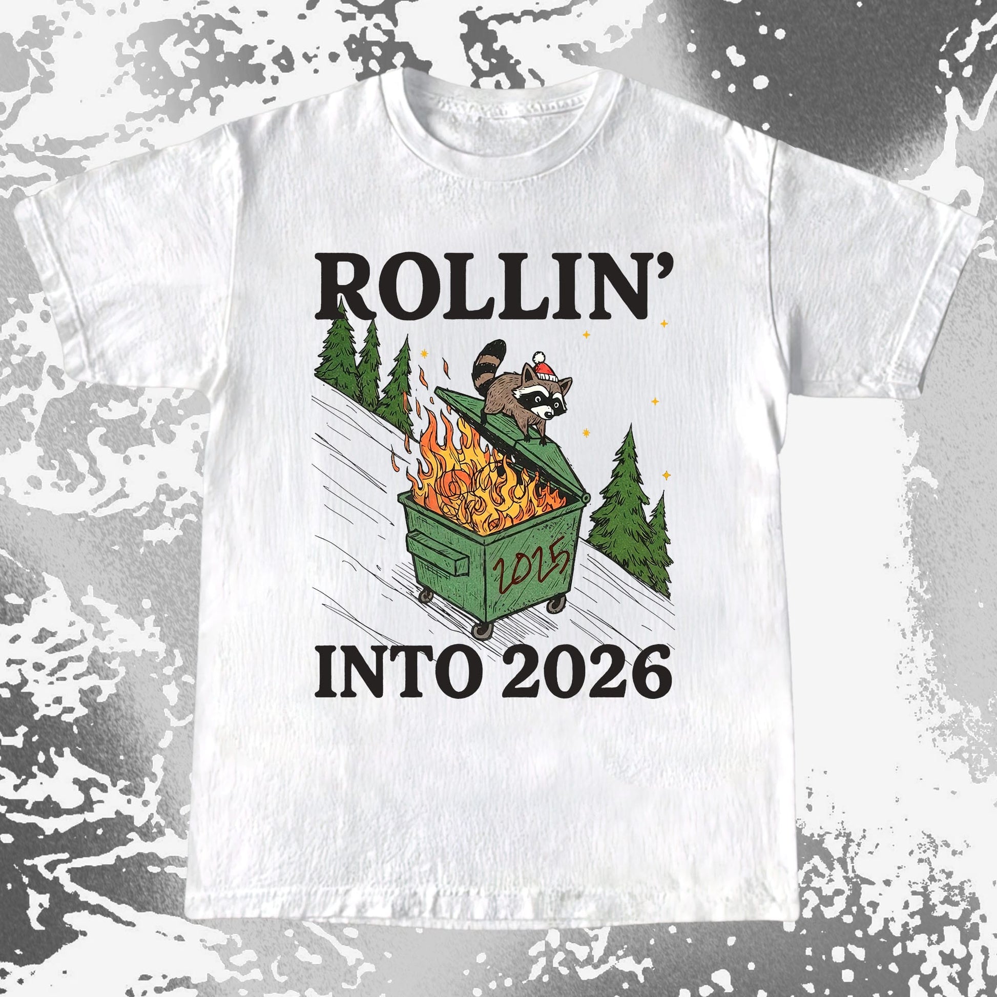 A festive little raccoon rides a flaming 2025 dumpster downhill like it’s his holiday tradition. It’s chaotic, cozy, and painfully relatable for anyone sliding into 2026 with “we’ll see what happens” energy.