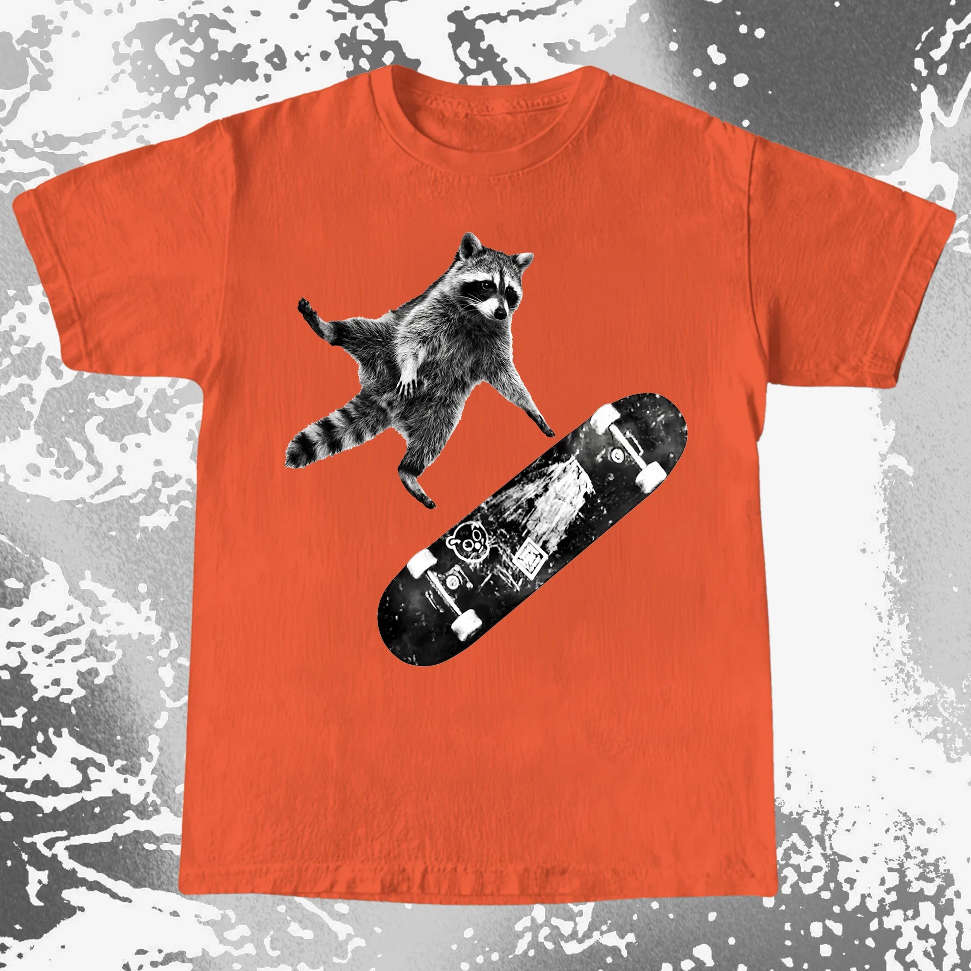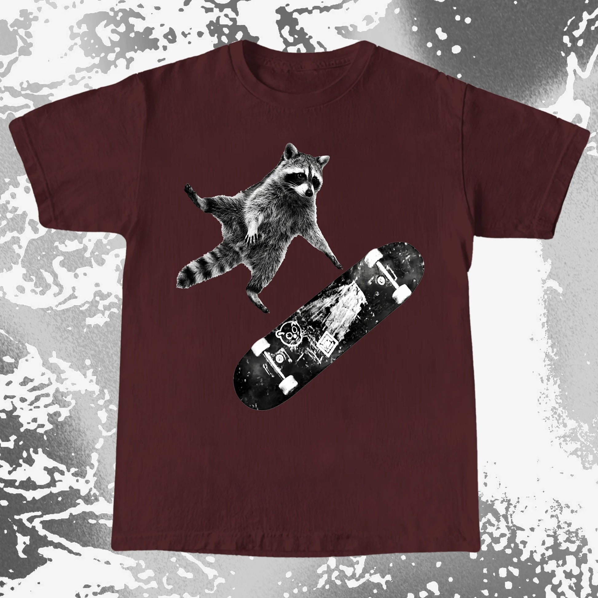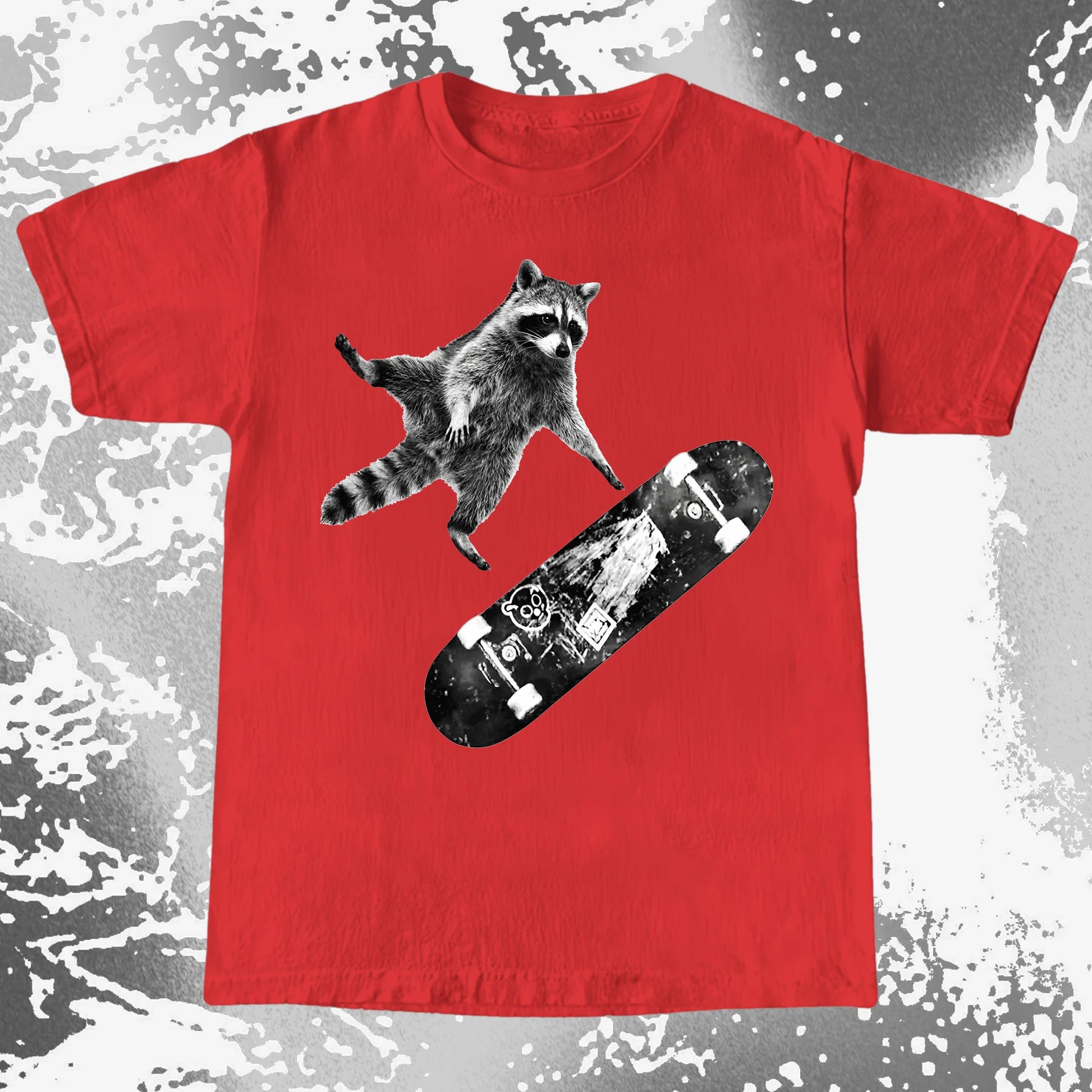 This design feels like the second before impact — when you’ve already jumped and there’s no turning back. A raccoon, a skateboard, and that quiet belief that falling is just part of learning how to fly.