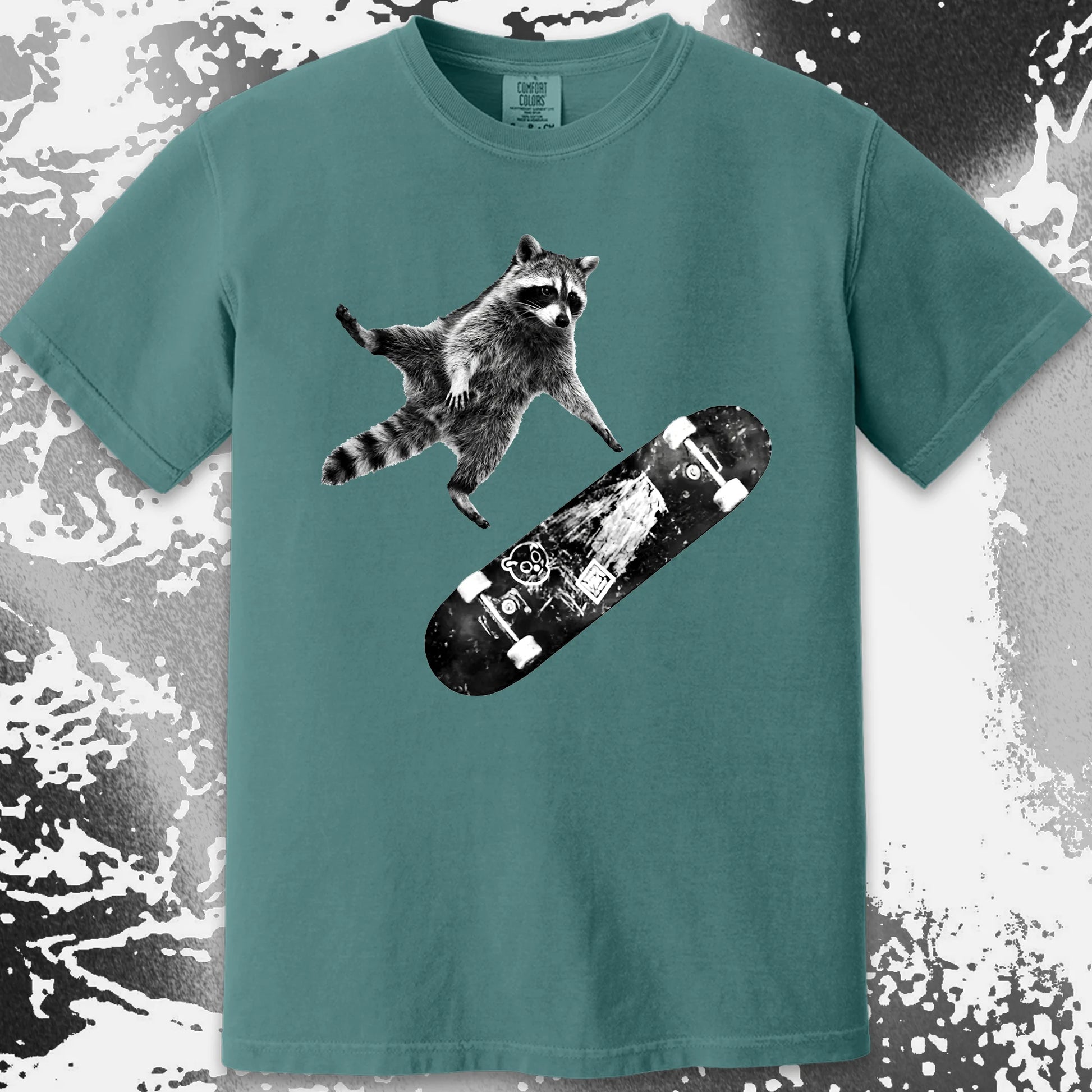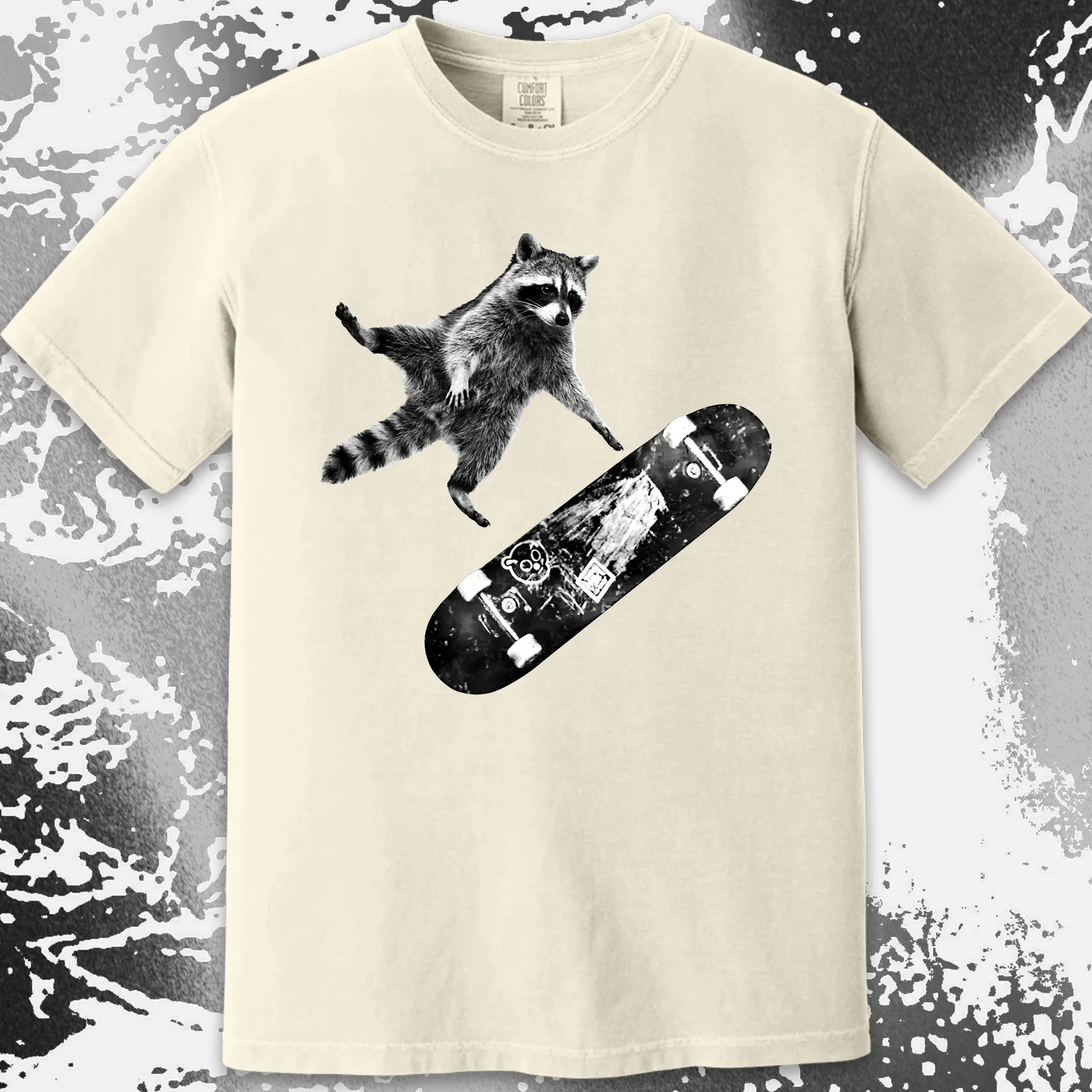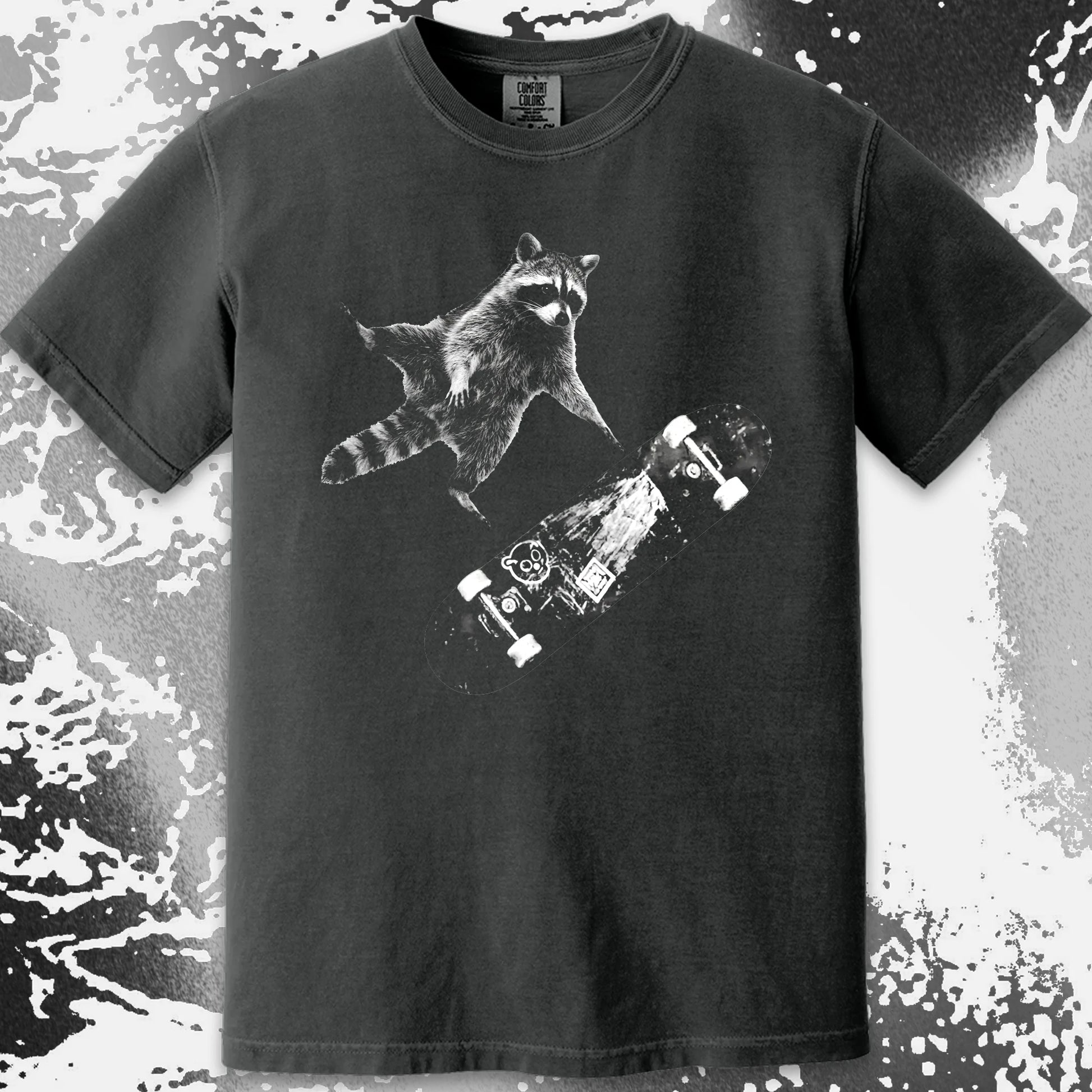 This design feels like the second before impact — when you’ve already jumped and there’s no turning back. A raccoon, a skateboard, and that quiet belief that falling is just part of learning how to fly.